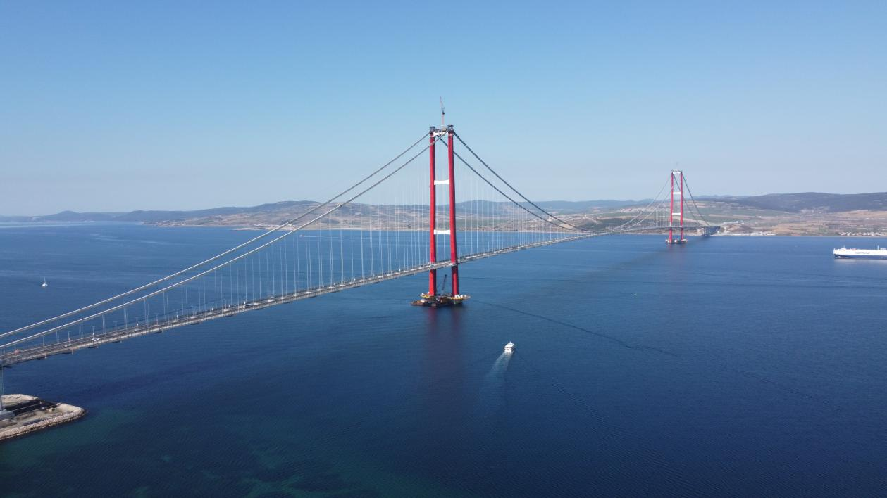 跨越土耳其馬爾馬拉海西端的達達尼爾海峽,連接歐亞兩洲,為雙塔三跨懸索橋,雙向六車道,橋梁主跨長度2023米,是目前世界上跨徑最大的懸索橋,于2022年3月18日建成通車。